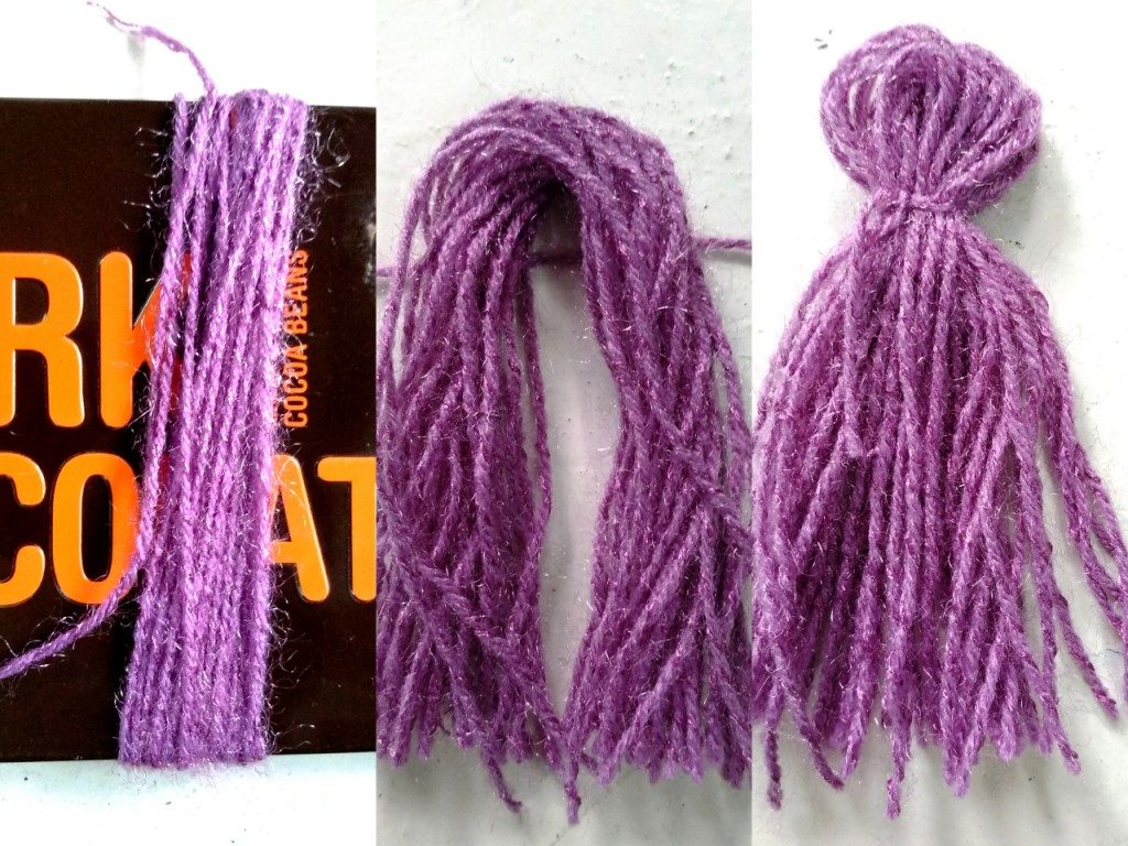 Cutting the Yarn: Wrap the white yarn 25 times around a long piece of cardboard/ruler or a ledger book. Remember, this would be the length of the longest yarn. Remove from the cardboard and cut one end. Now it looks like a tassel, almost!